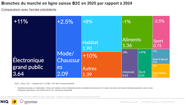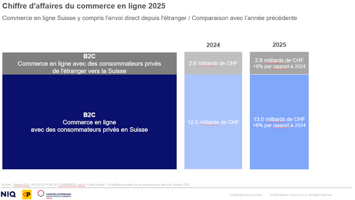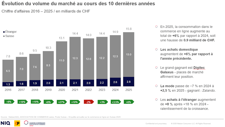 - La consommation du commerce en ligne augmente de +6 % en 2025 par rapport à 2024, soit 0,9 milliard de francs suisses.