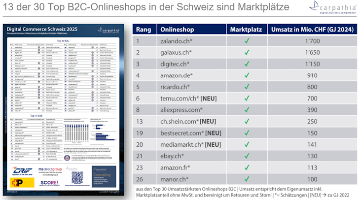 Les résultats de l’étude montrent clairement la position dominante des places de marché. En particulier le leader du secteur Digitec Galaxus, mais aussi Zalando ou Ricardo, renforcent considérablement leur avance. Comme le montre l’analyse de Carpathia, 13 places de marché figurent parmi les Top 30 boutiques en ligne B2C.