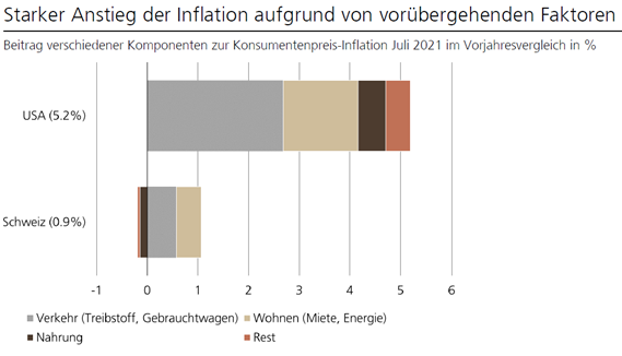 Verglichen mit 2020 liegt per Juli 2021 ein starker Anstieg der Inflation in den USA (5.2%) sowie in der Schweiz (0.9%) vor. Getrieben wird die Inflation von erhöhten Preisen im Bereich Verkehr, Miete, Treibstoff und Nahrung. Allerdings geht die UBS davon aus, dass diese Faktoren auf die Pandemie zurückzuführen und deshalb vorübergehend sind. Die UBS geht davon aus, dass in den USA die Inflationsrate für Dienstleistungen auch während der Pandemie konstant geblieben ist, dies im Vergleich zu Güter, welche in den letzten 12 Monaten eine starke Inflationsentwicklung durchlaufen sind.