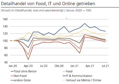 Abb. 4: Entwicklung der Detaihandelsumsätze nach Kategorien Jan 2020 – Juli 2021 (Quelle: BFS, UBS GWM CIO).