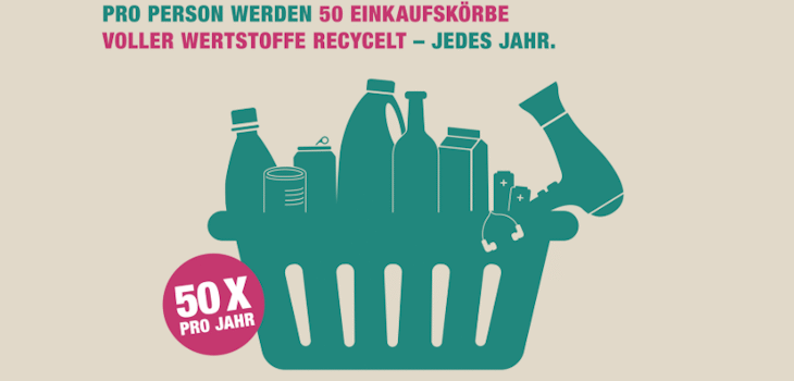 Jede Person in der Schweiz bringt pro Jahr 50 prall gefüllte Einkaufskörbe voller Wertstoffe zurück in den Kreislauf – und trägt so dazu bei, dass aus gebrauchten Materialien wieder neue Rohstoffe entstehen.