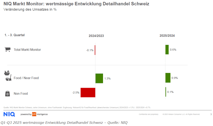 Der Schweizer Detailhandel (on- und offline) hat sich in den ersten neun Monaten des Jahres mit einem nominalen Umsatzzuwachs von 0.6% leicht positiv entwickelt. Das Teilsegment Food / Near Food liegt 0.9% im Plus, Non Food hat 0.1% gewonnen. Im Vergleich zum Q3 des Vorjahres waren die Monate Juli, August und September im 2025 stärker, sodass gegenüber den ersten sechs Monaten Food / Nearfood 0.2 Prozentpunkte und Non Food 0.3 Prozentpunkte zulegen können. Das Segment Non Food schafft damit den Sprung in die Wachstumszone, nachdem im ersten Halbjahr noch ein Minus von 0.2% zu Buche schlug.