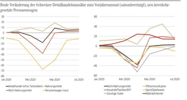 Abb. 2: Entwicklung der Detailhandelsumsätze nach Kategorien Jan – Juli 2020 (Quelle: BFS, UBS GWM CIO).